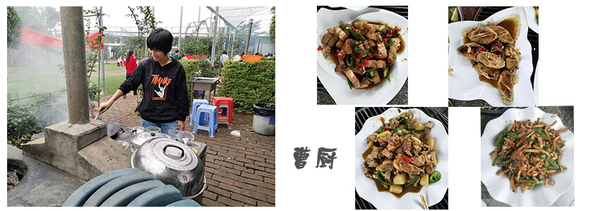 中午12点抵达清远第一个目的地----花卉小镇,开始我们的第一项活动----农家乐。俗话说“自己动手,丰衣足食”,各位大厨大展身手,就连不会做饭的某某人(在此就不点名了哈,否则真的要嫁不出去了,哈哈......),也跃跃欲试。